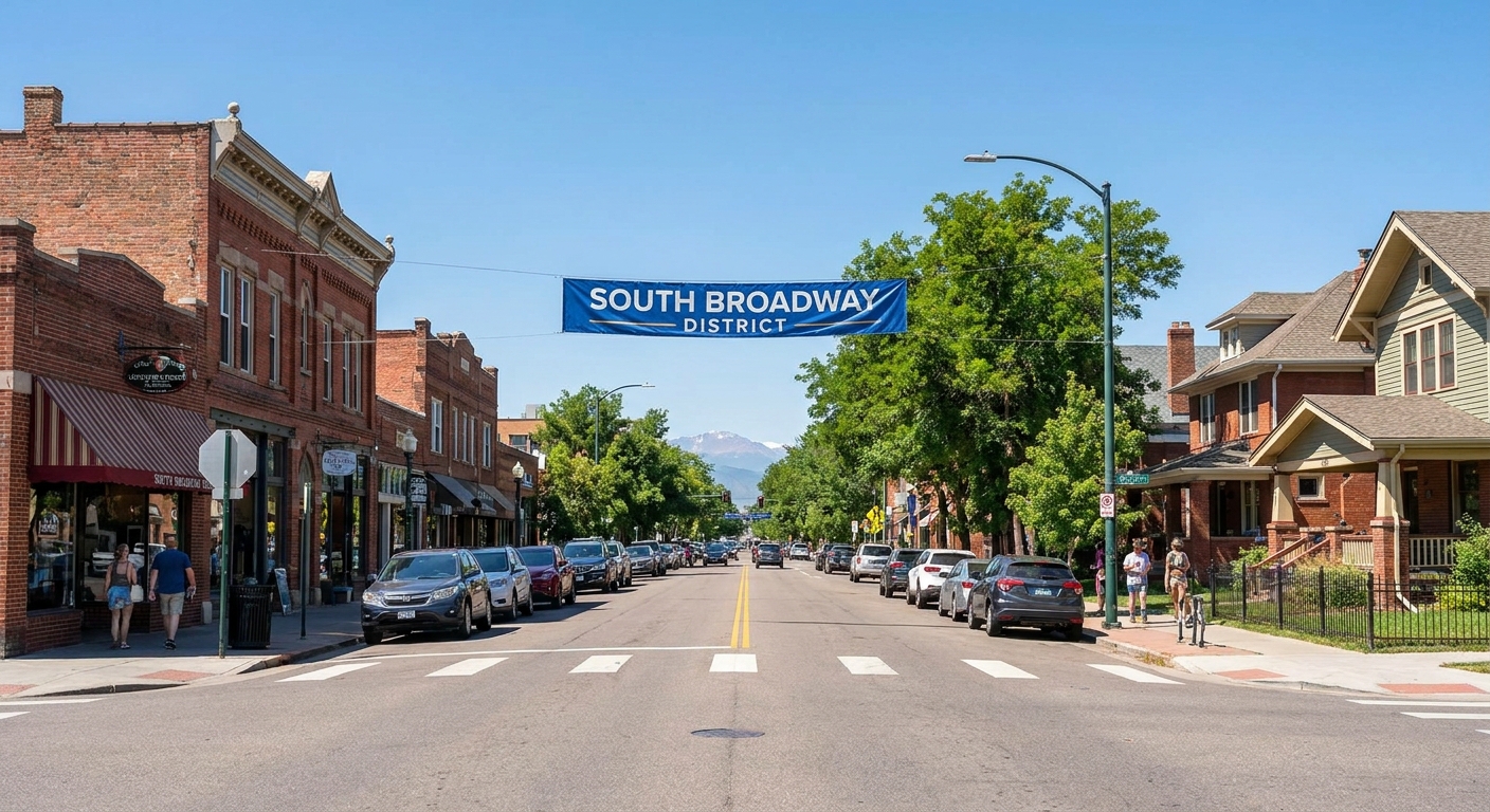 South Broadway runs from south of 6th Avenue to north of I-25, through the Baker neighborhood. Once a transit corridor anchored by auto dealers and light industrial uses, it became Denver’s most authentically weird commercial strip over the last two decades. Vintage clothing stores, music venues, art galleries, craft bars, and restaurant staples like Denver Biscuit Co. and Adrift Tiki Bar now define the street identity (City Cast Denver, 2025).